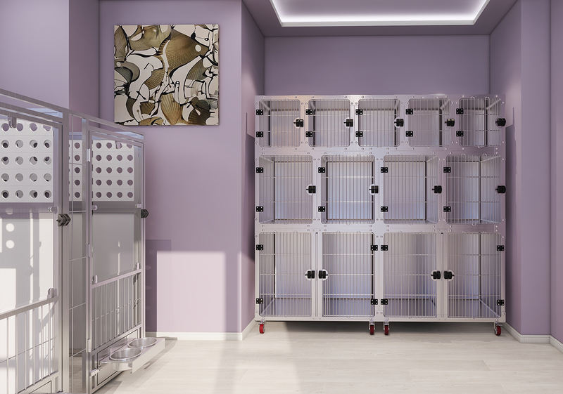 Çok Amaçlı Hayvan Yatma ve Karantina Kafesi, idrar sızıntısını önlemek için dışa doğru eğimli kenarlara ve dikişsiz sıçrama korumalarına sahip bir atık tepsisine sahiptir. Ayak dayanağı ızgarası, kopmuş kaynakları ve kir birikmesini ortadan kaldırmak için yüksek frekanslı kaynak kullanır. Kayar kapı kilidi, manyetik çift kilitli kapı sistemi içeren seçili modellerde evcil hayvanın kaçmasını önlemek için otomatik olarak sabitlenir.